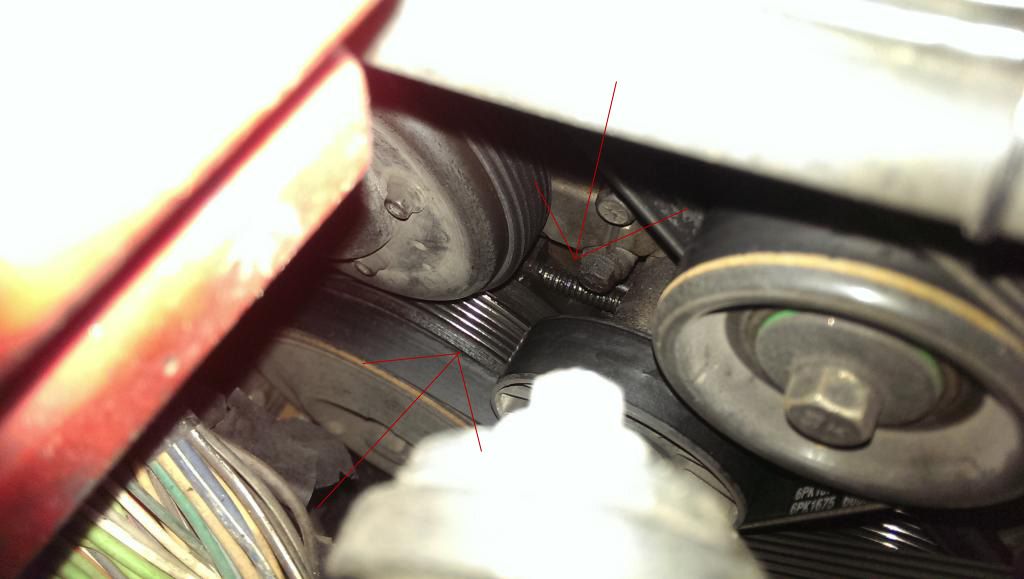And back behind the Crank Pulley. The further back ribbed portion of the Crank Pulley, where the Alternator Belt rides on was wet as well, as indicated by the arrows:
